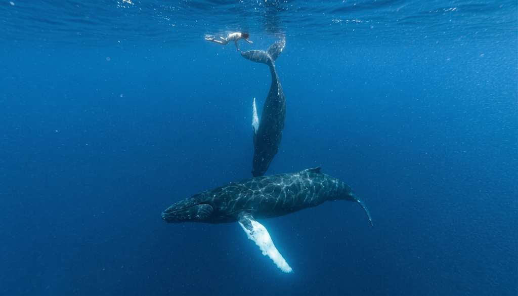 In April 2023, diving off Bermuda, three humpbacks swam to my friends and me - a mother, her calf, and a male escort. The calf, new to the world and encountering creatures it had never seen, kept swimming up to us, then back down to its mother. Up and down. Reaching out, checking in, returning. Not random. Not fearful. A loop of connection.